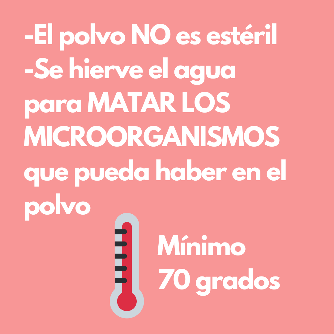 Por tanto, hay que hervir siempre el agua que se usa. Debe estar mínimo a 70 grados Celsius cuando se añade el agua al polvo.